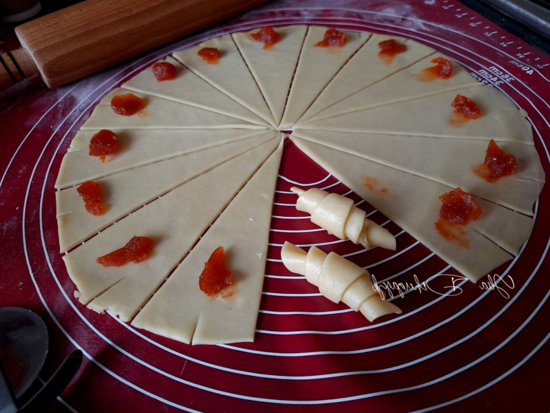 Розкачувати тісто (3-4 мм) і формувати рогалики.