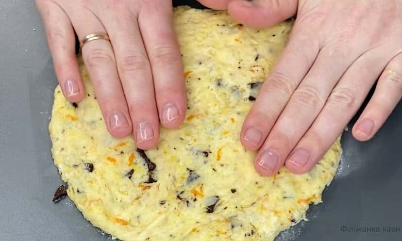 А тепер акуратно руками сформуйте невеликий коржик, товщиною приблизно 1-1,5 см.