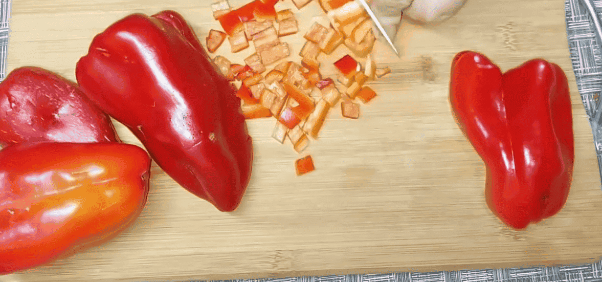 2. Болгарський перець нарізати дрібними кубиками, дрібно нарізати часник, кріп та петрушку.