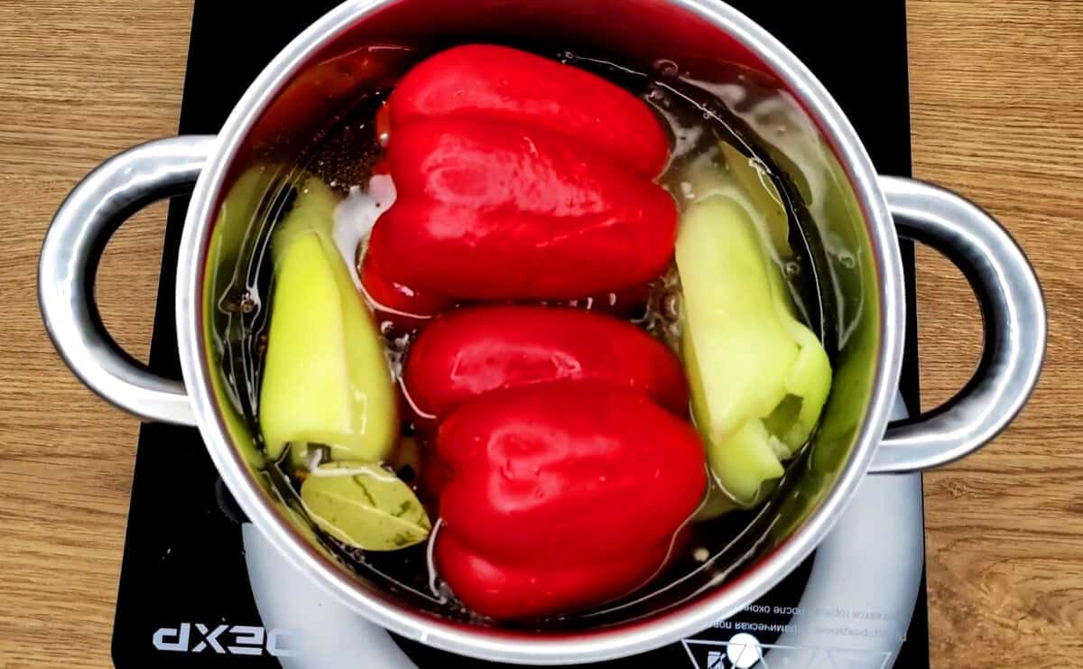 Доводимо до кипіння і додаємо перці і постійно перевертаючи їх в розсолі варимо 6-7 хвилин і виймаємо.