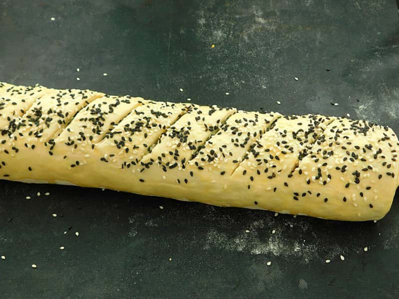 9. Нанести надрізи. Це запобігатиме розтріскуванню штруделю, що досить часто відбувається при випіканні. Посипати кунжутом.
