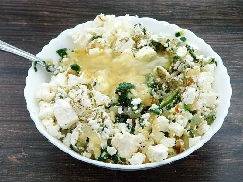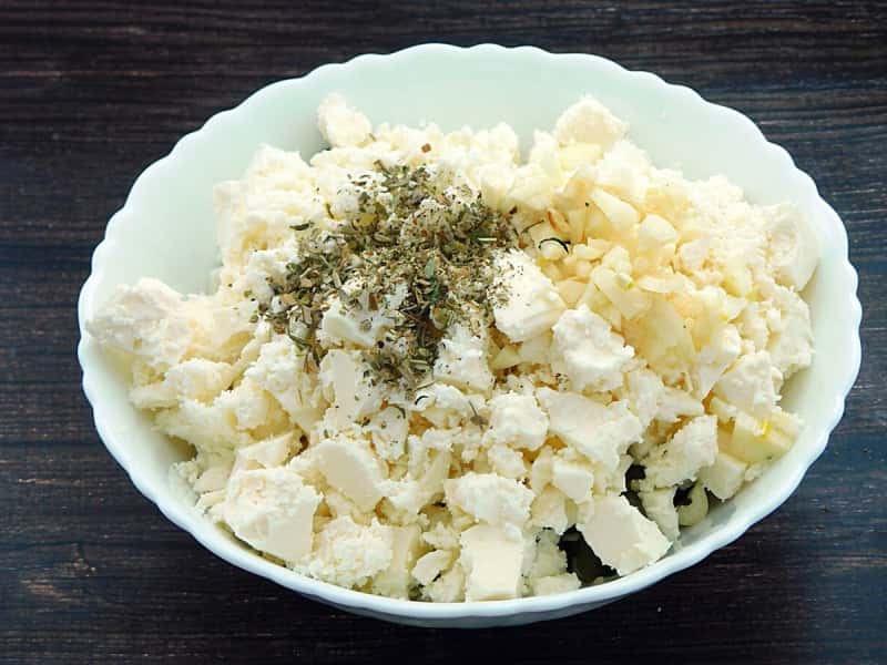 4. Фету розкришити руками, додати нарубаний часник, прованські трави та трохи солі за потреби. Перемішати.