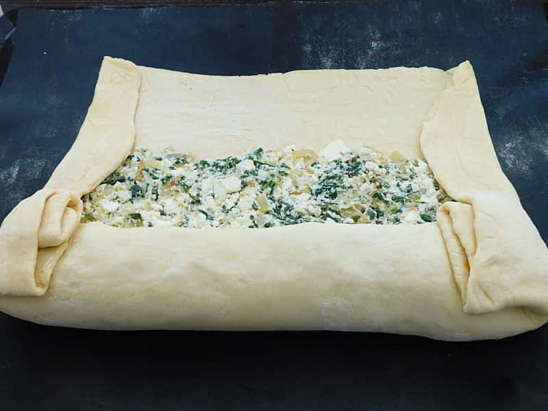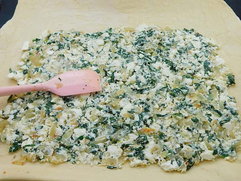6. Тісто трохи розкачати, товщина близько 3 мм. Розподілити підготовлену суміш сиру, шпинату та цибулі, залишаючи вільними пару сантиметрів з усіх боків.