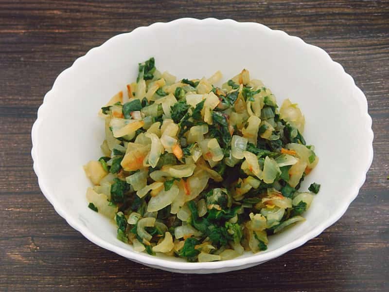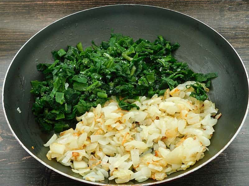 2. Цибулю ріпчасту нарізати кубиками, обсмажити на олії до прозорості та невеликої позолоти. Додати порізаний стрічками шпинат, заморожений не розморожувати.