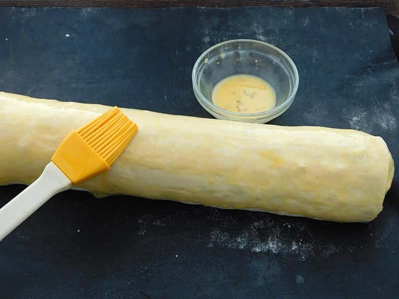 8. Продовжити згортання. Укласти швом вниз. Змастити залишеним раніше яйцем.