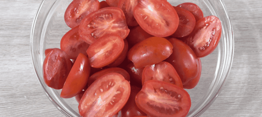 Помідори нарізаю навпіл. Намагаюся брати м’ясисті помідори, щоб баклажани не “плавали” в готовій страві.