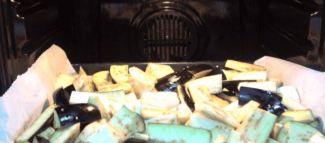 Викладаю баклажани на деко і відправляю в розігріту до 180 градусів духовку на 20 хвилин. Запікаю в режимі конвекції.