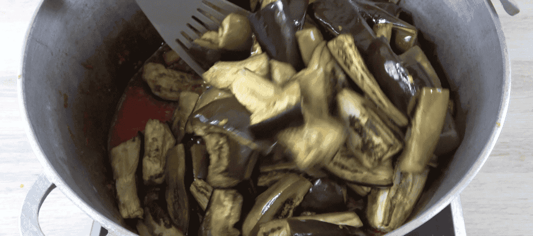 Коли баклажани готові (трохи підрум’янилися), виймаю їх із духовки. Вливаю в казан оцет і викладаю баклажани.