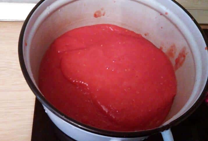 Помідори нарізала четвертинками, помістила в стакан і подрібнила їх за допомогою блендера. Вилила томатну масу в каструлю. На середньому вогні доводжу до кипіння.
