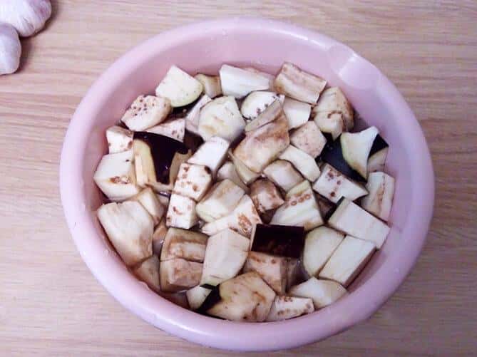 Почала я з баклажанів. Я їх помила, відрізала плодоніжки. Ті, у яких вид був не дуже привабливий, почистила. Нарізала їх великими кубиками.