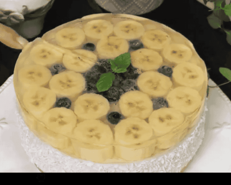- Кружечки бананів викласти на суфле та залити половиною желе. Забрати в холодильник на 10 хвилин, щоб схопився. Потім вилити желе, що залишилося.