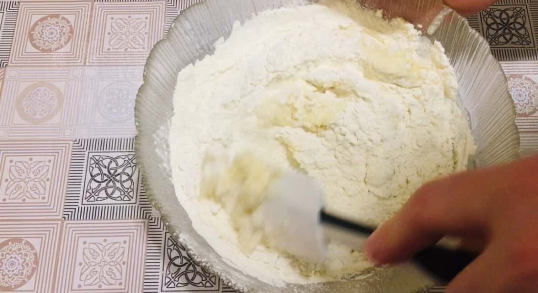У чашу для просіювання борошна всипаємо 200 г борошна, 1 ч л розпушувача розмішуємо сухі інгредієнти і просіюємо в сирну масу, замішуємо тісто.