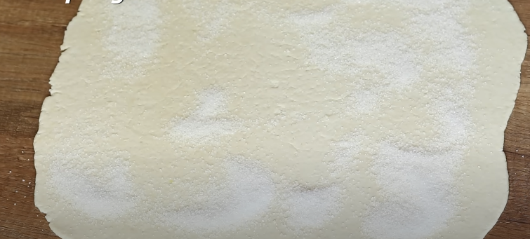 Тісто розкачати у прямокутний пласт, посипати цукром,