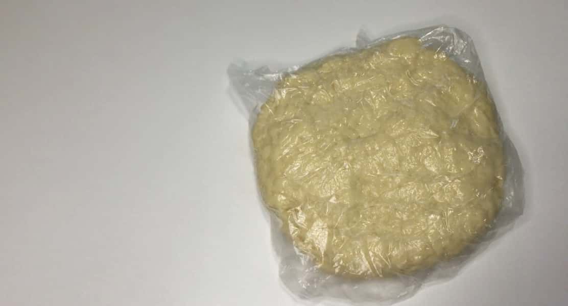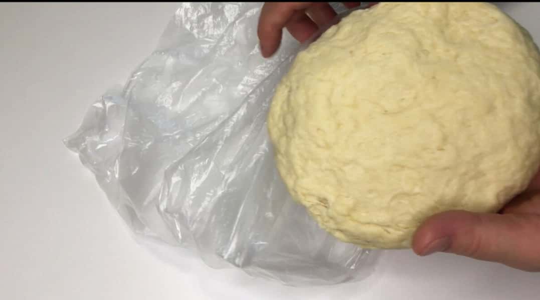 Тісто довго місити не треба просто зібрати в кулю, перекласти в пакет, розрівняти в пласт і покласти в морозилку на 15 -20 хвилин.