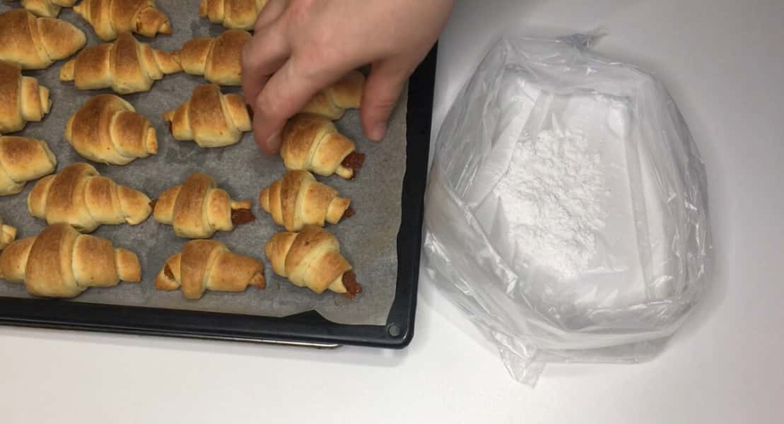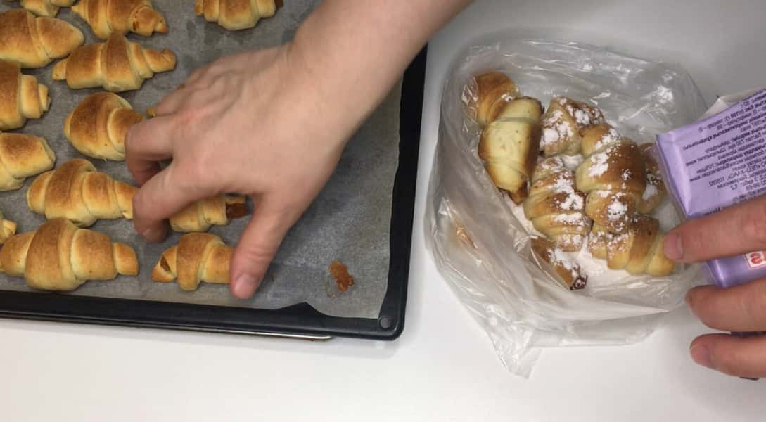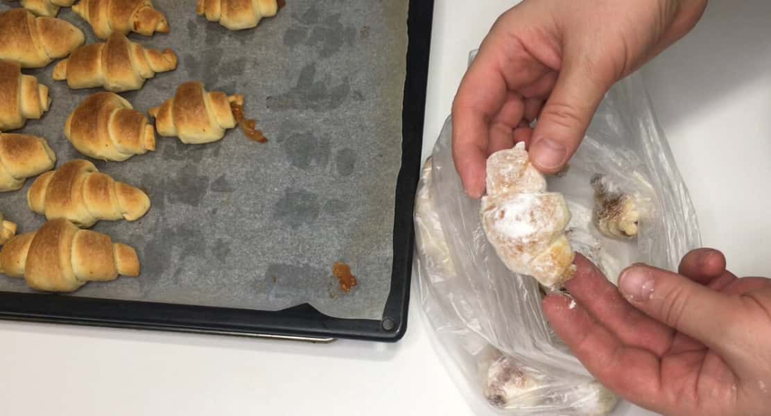 У пакет насипаємо 2 ст л цукрової пудри, перекладаємо туди теплі рогалики, закриваємо пакет та обвалюємо рогалики.