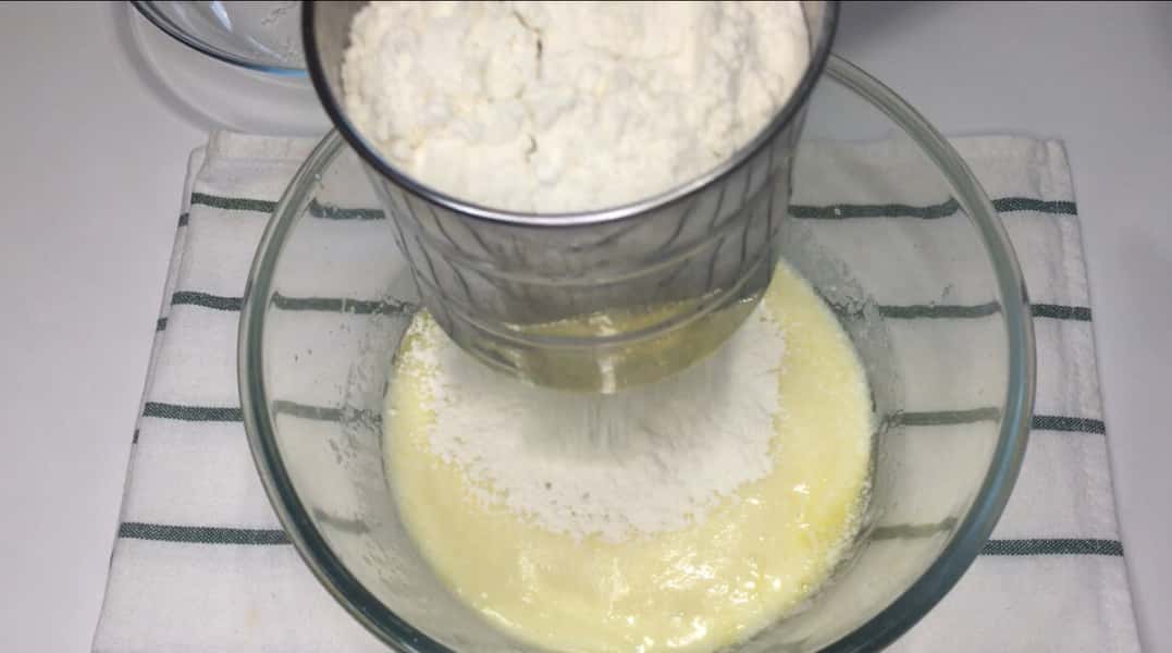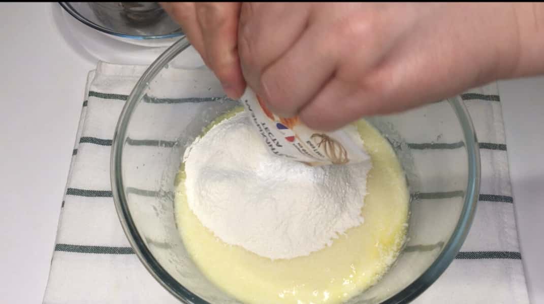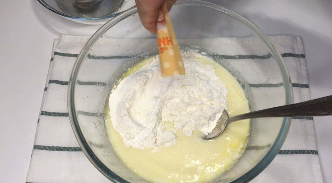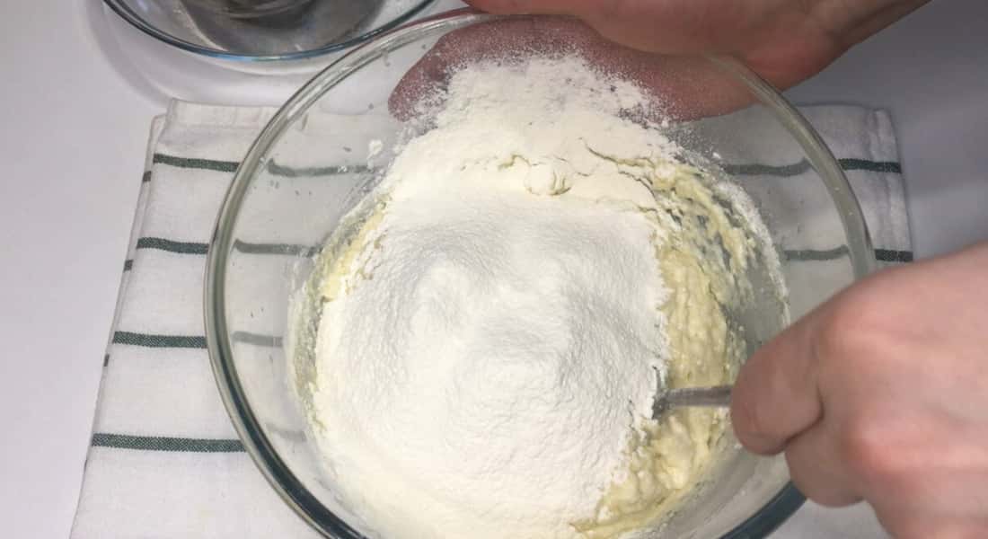 Потім просіюємо частину борошна, додаємо 10 г розпушувача, щіпку ванілі, змішуємо з борошном і замішуємо тісто. Всього на заміс тіста мені знадобилося 330 г борошна.