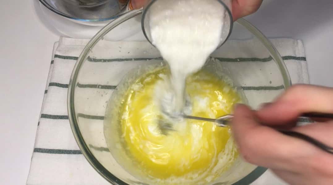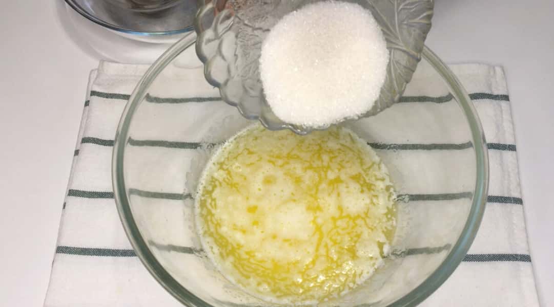 У миску вливаємо 130 г злегка теплого розтопленого вершкового масла, додаємо 1/4 ч л солі, 30 г цукру і вливаємо 200 мл кефіру і добре все розмішуємо.