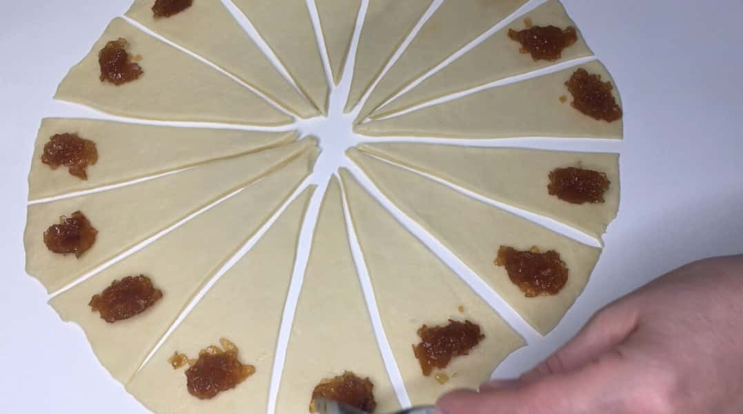 На край кожного шматочка тіста викладаємо начинку, одну частину рогаликів я зробила з яблучним варенням, а іншу – зі згущеним молоком молоком.