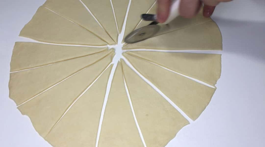 Розгортаємо в тонкий пласт, завтовшки 2-3 мм, нарізаємо на 16 частин.