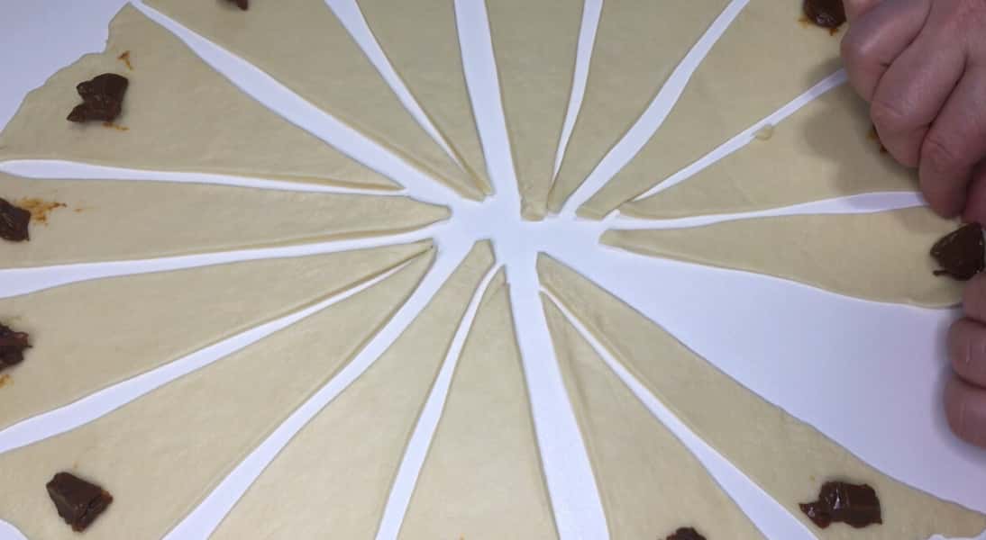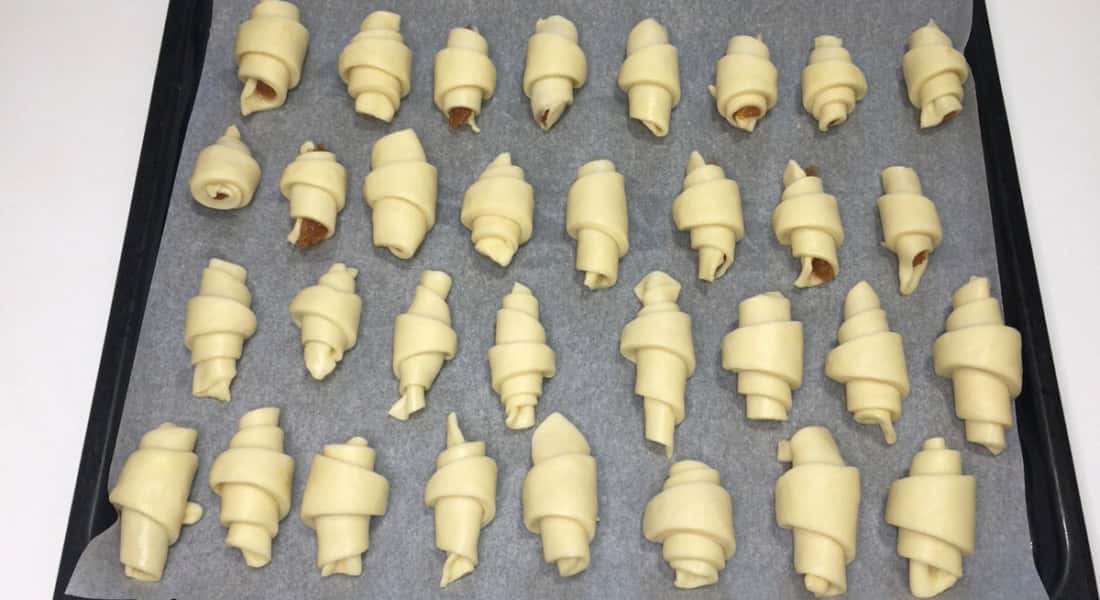 Формуємо рогалики і укладаємо на деко, так щоб хвостики були внизу.