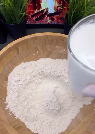 🔻Змішуємо борошно, сіль, цукор, ванільний цукор і розпушувач. Вливаємо теплий кефір та 1 ст л олії. Замішуємо тісто, що липне до рук.