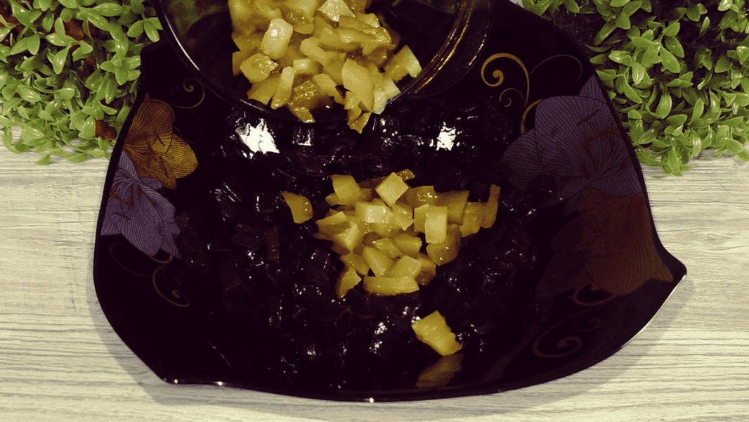 Додати мариновані, можна солоні огірки, їх беріть приблизно в половину менше, ніж буряка.