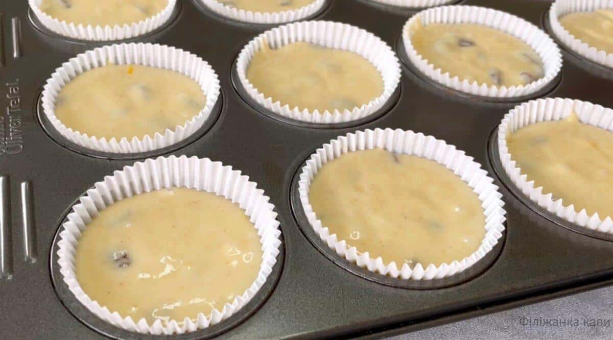 Додаємо вимочені і просушені родзинки і перемішуємо. Заповнюємо форми для маффінів. Прибираємо в розігріту до ста вісімдесяти градусів духовку – на двадцять дві-двадцять п’ять хвилинок – дивіться по своїй духовці