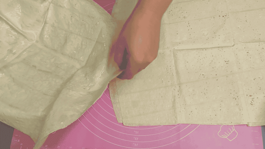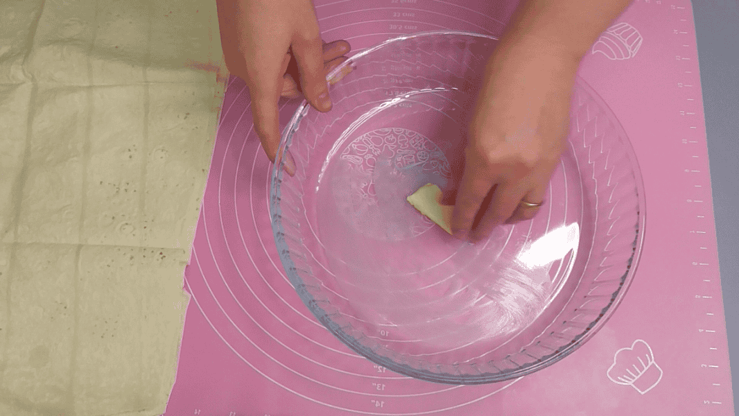 ✅ Беремо лаваш та обрізаємо краї, роблячи з нього квадрат. Форму для пирога змащуємо вершковим маслом.