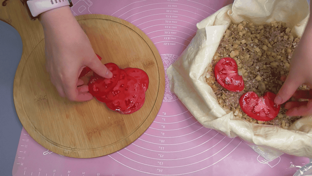 ✅ Потім нарізаємо помідори кружальцями і викладаємо зверху на фарш.