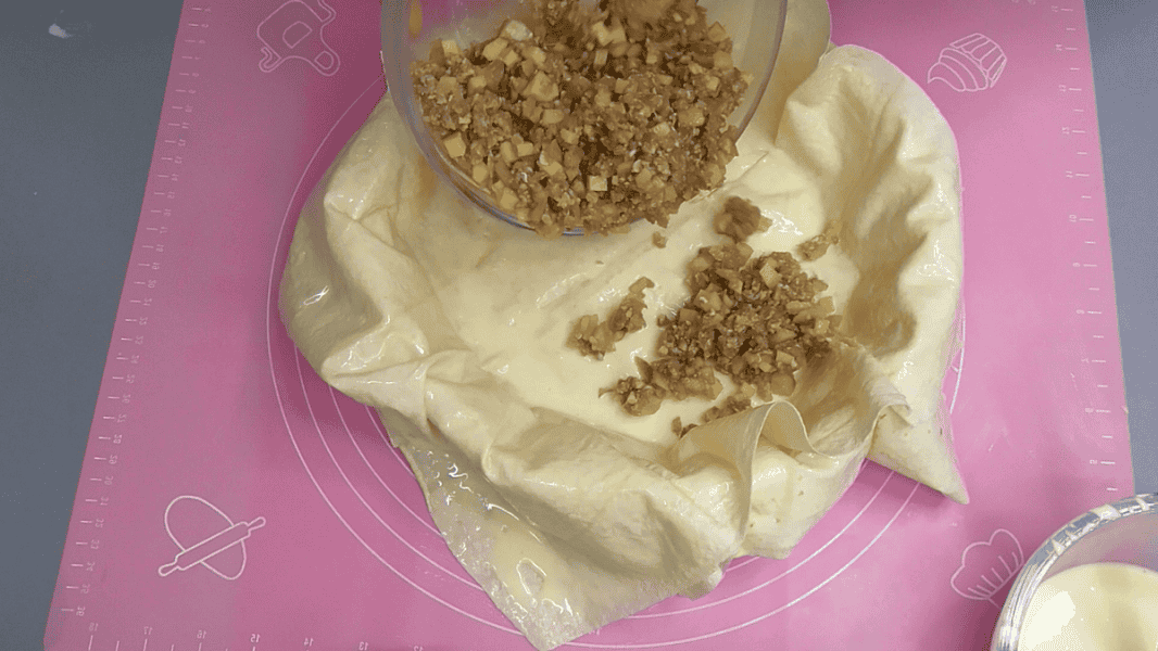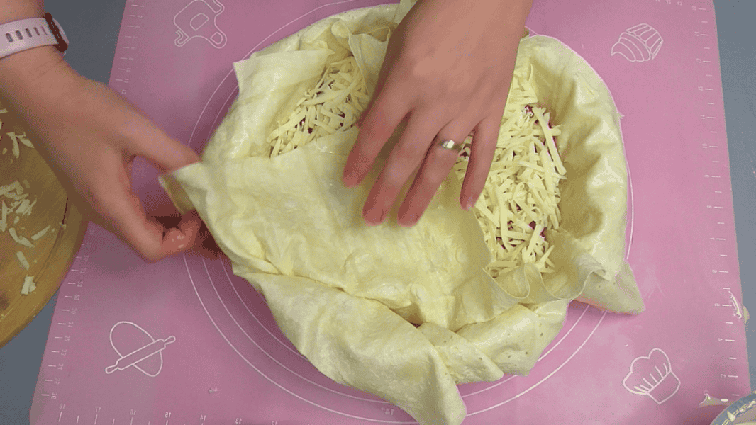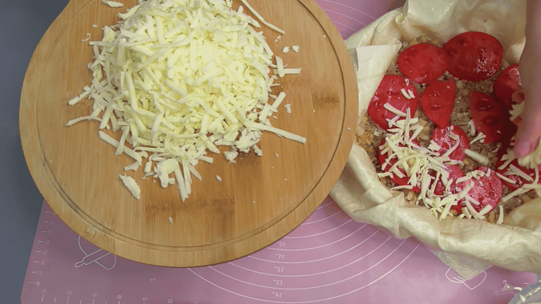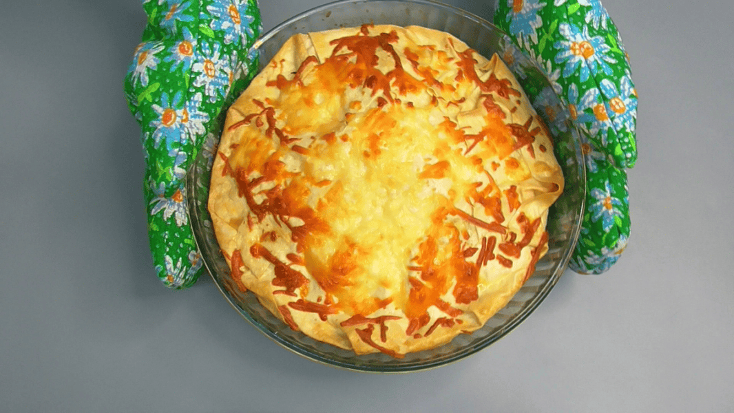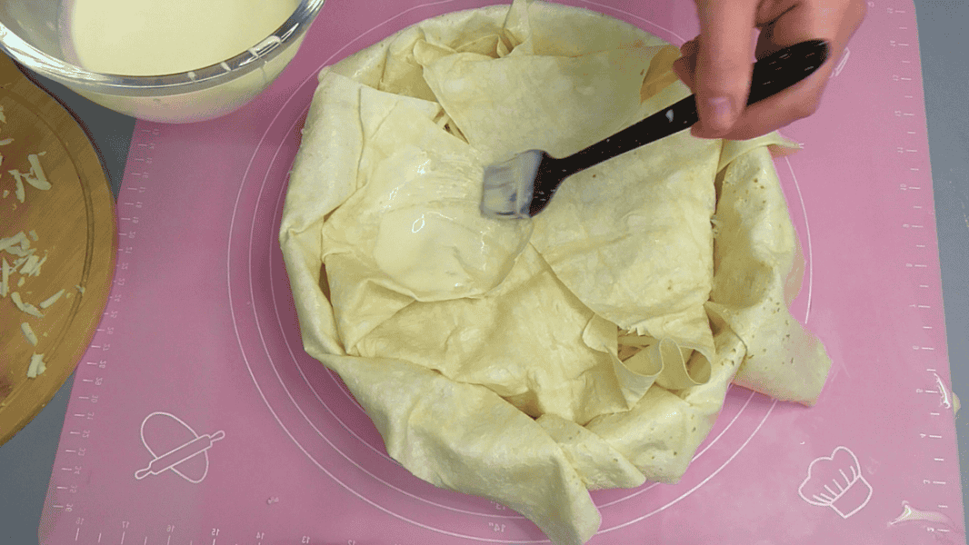 ✅ Закриваємо пиріг краями лаваша, кожен шар змащуючи сметанною сумішшю. Можна посипати зверху залишками сиру.