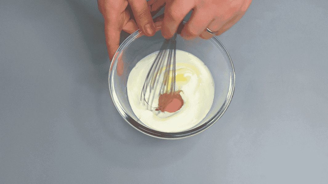 ✅ У сметану додаємо майонез та яйце, сіль і добре перемішуємо.