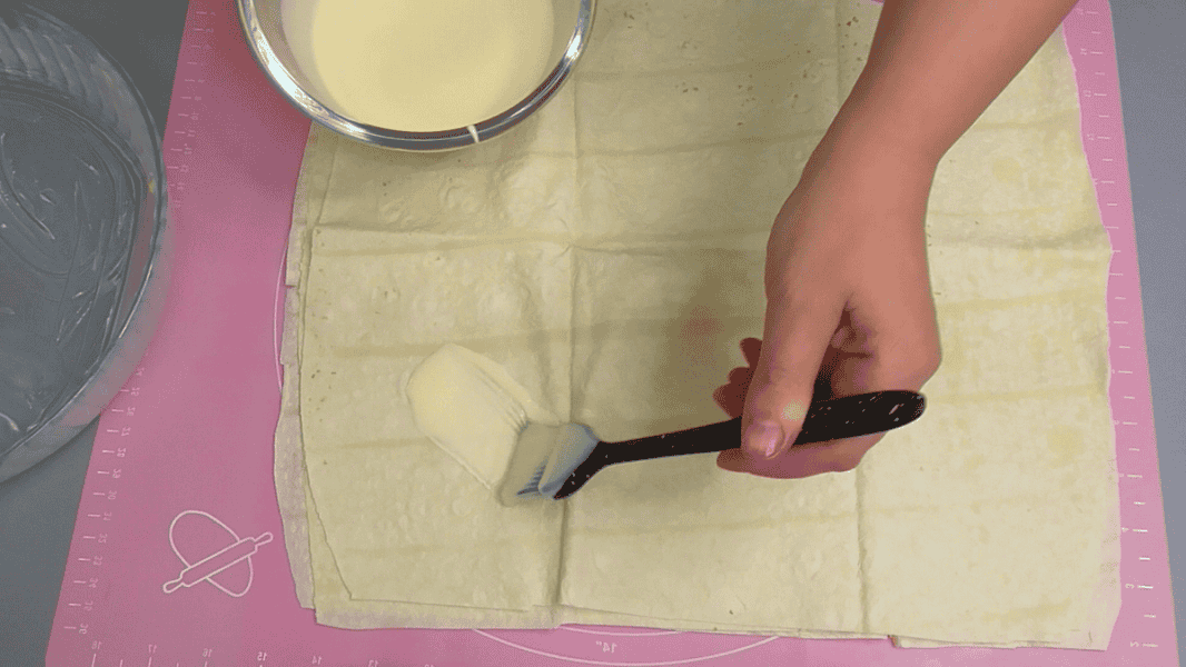 ✅ Добре змащуємо кожен лист лаваша сметанною сумішшю та по черзі перекладаємо у форму для випічки. Кладемо кожен лист лаваша так, щоб кути залишалися вільними.