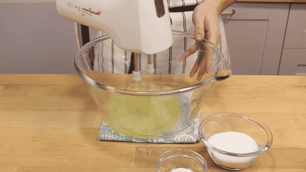 Тепер бісквітне тісто: Жовтки потрібно відокремити від білків. До білків додаю щіпку солі та збиваю в піну.