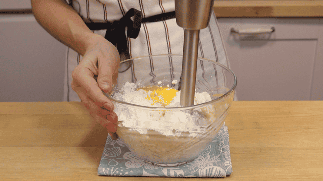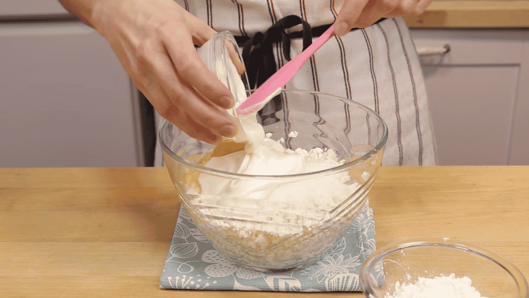 Просіюю борошно, що залишилося. Перемішую. Вливаю воду. Перемішую лопаткою, акуратно щоб зберегти легкість тіста.