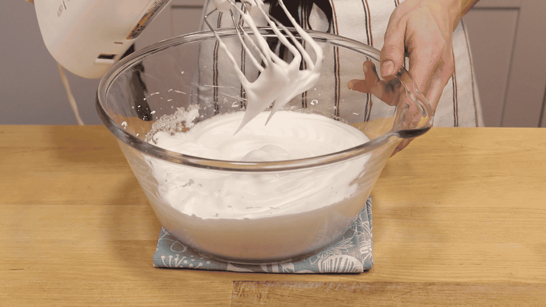 Тепер по трішки підсипаю цукор та ванільний цукор і збиваю до стійких піків.