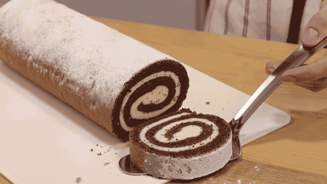Присипаю рулет цукровою пудрою та нарізаю на шматочки.
