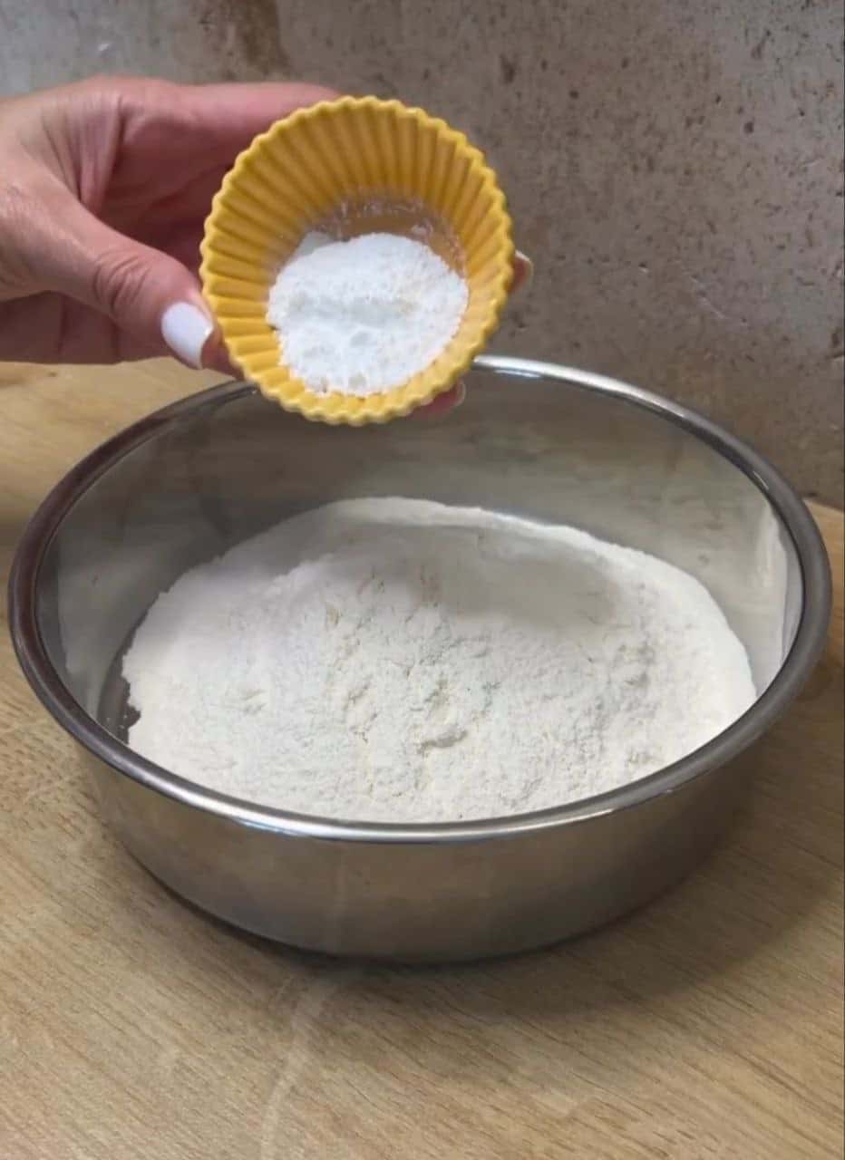 До борошна додаю розпушувач, з’єдную і замішую тісто.