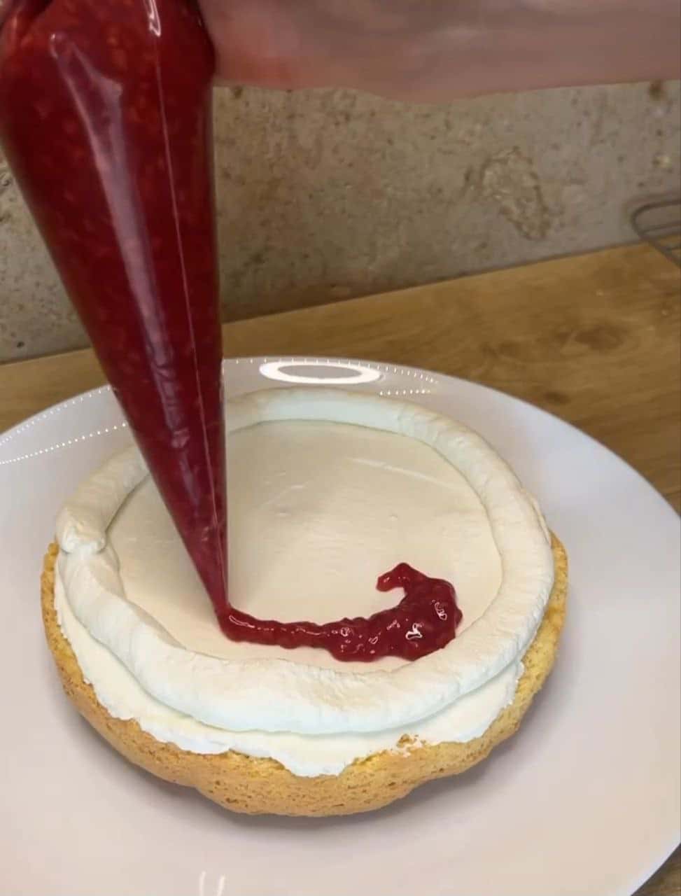 Корж – крем тонким шаром – бортик із крему – конфітюр малиновий -корж.