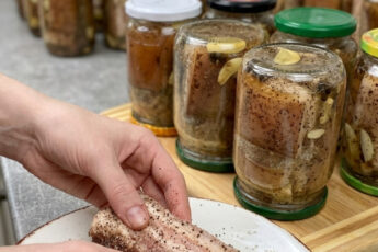 4. За цей час чисті банки заповнюємо спеціями. На дно банки кладемо запашний перець 4-5 штук, чорний перець горошком 9-10 штук, насіння гірчиці 1 чайну ложку. Нарізаний часник, пару гілочок петрушки.