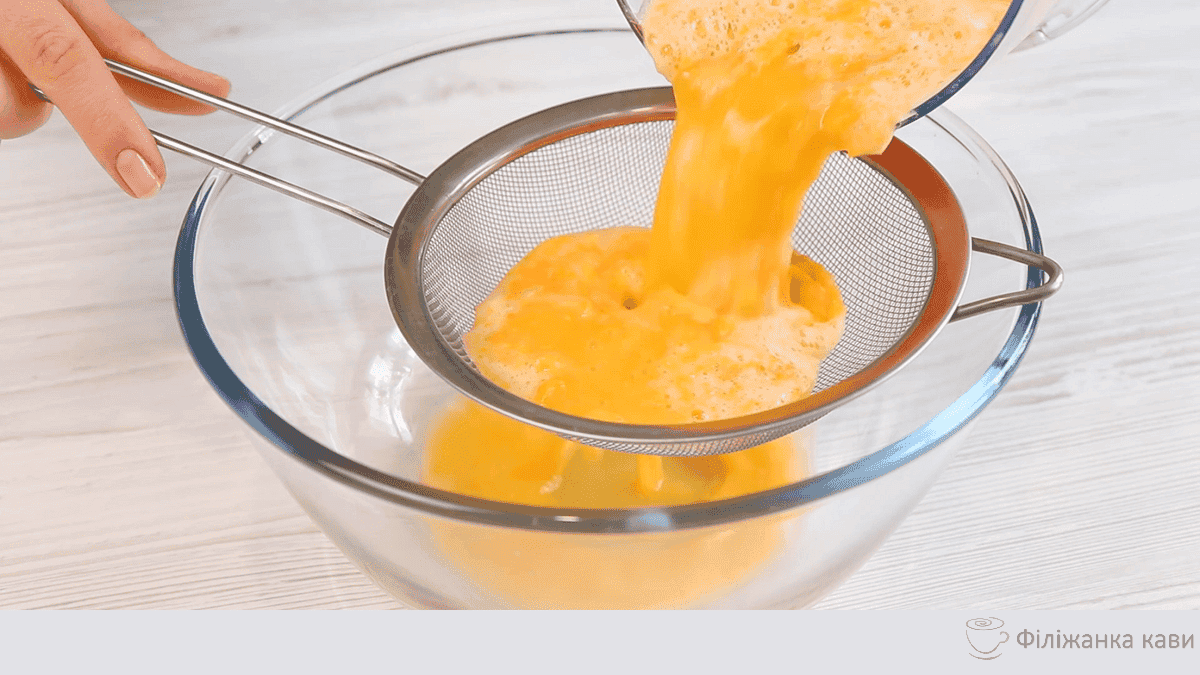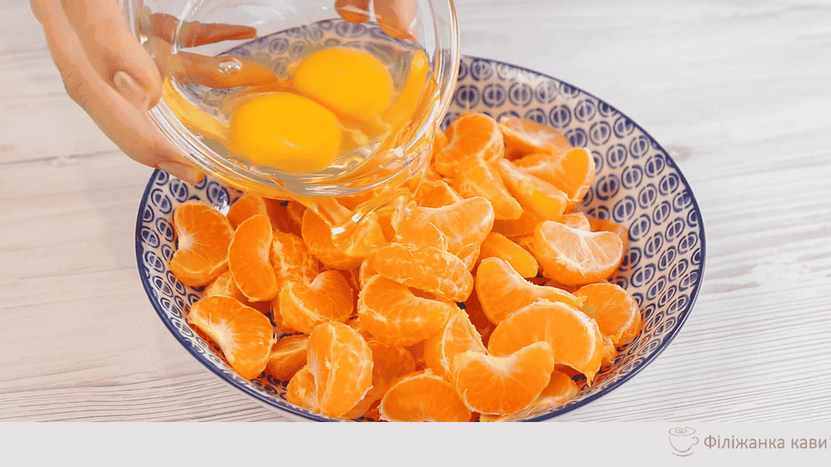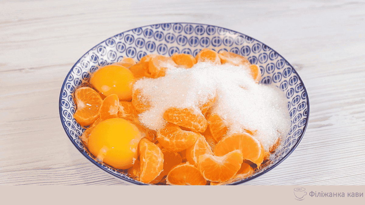 Далі мандарини очищаємо від шкірки ( вага без шкірки – 400 г ) і ділимо на часточки. Додаємо 2 яйця кімнатної температури і 100 г цукру. Продукти подрібнюємо в блендері, а потім проціджуємо через сито.