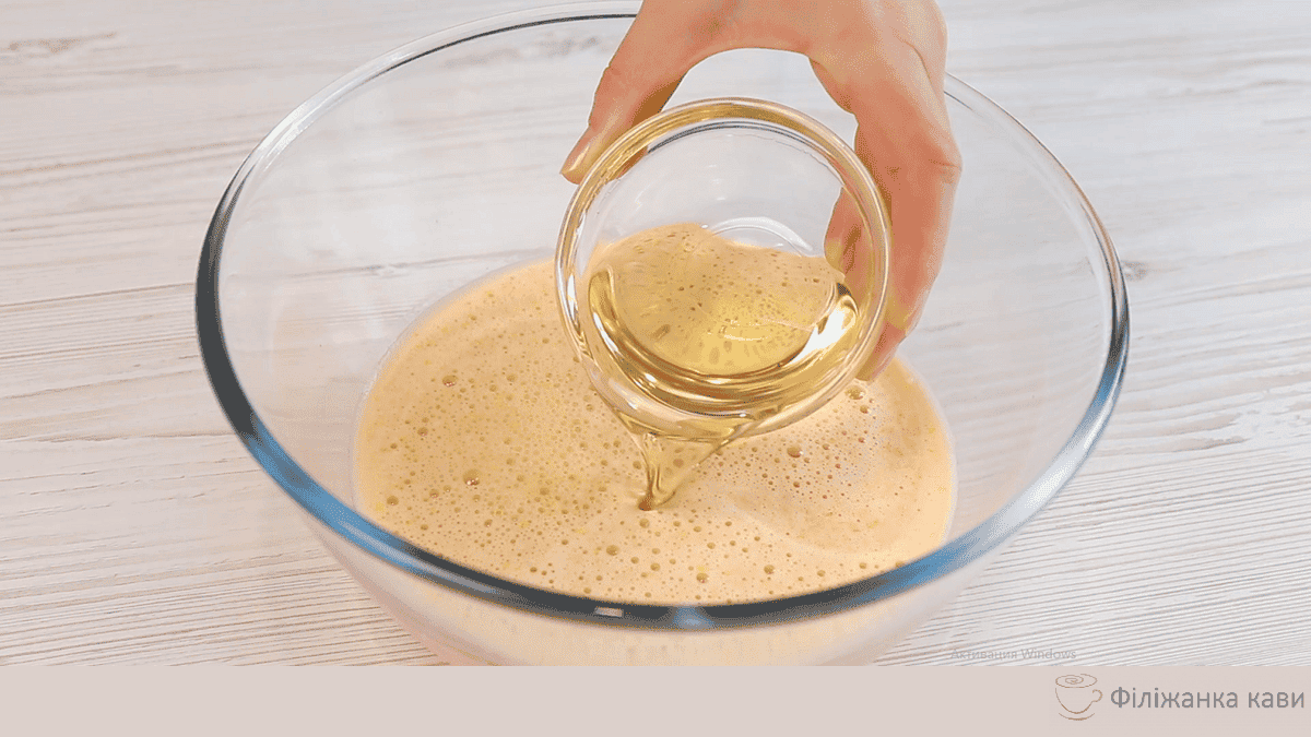 В отриману рідину ( 450-470 г ) додаємо 1 ч. л сухих дріжджів. Перемішуємо вінчиком. Важливо, щоб мандаринова рідина була кімнатної температури, не холодною. Далі вливаємо 50 мл рафінованої олії. Перемішуємо.