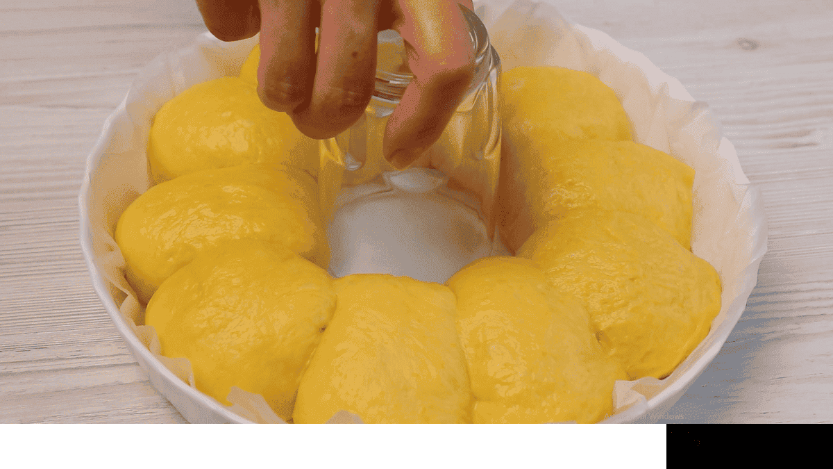 Заготовки викладаємо в форму по краю, залишаючи в середині вільне місце. У мене кругла форма d-26 см, дно і боки форми я застелила пергаментів. В середину форми кладемо склянку ( в місці стику з тістом стакан змащуємо олією ). Тісто накриваємо харчовою плівкою або кухонним рушником. Кладемо його на 30 хвилин на разстойку.