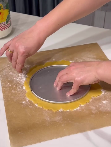 Кожну кульку розкотити на пергаментному папері в тонкий пласт, вирізати коло діаметром 20 см, зібрати обрізки. Перекласти на деко для випікання.