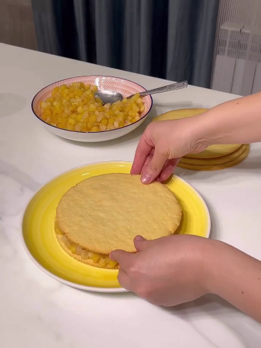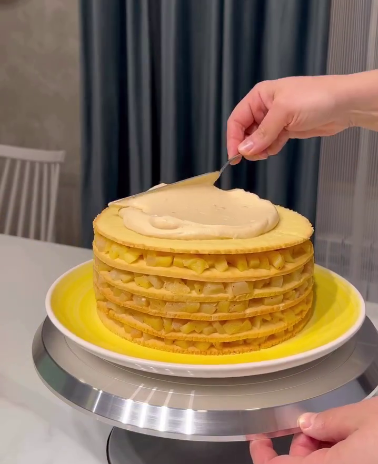 Складання торта: На корж рівномірним шаром розподілити яблучну начинку, верху покласти другий корж