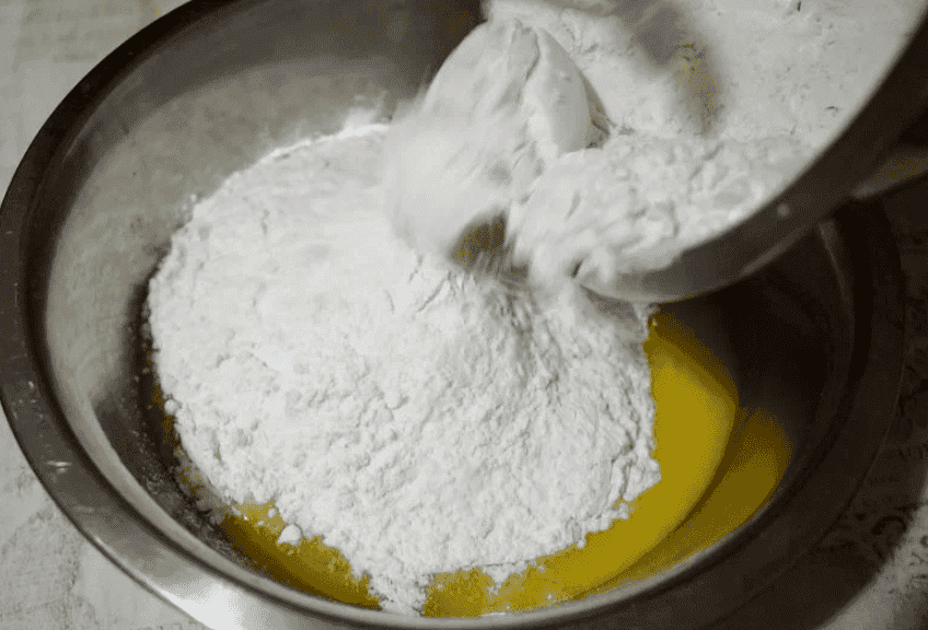 Знову трохи перемішуємо і всипаємо борошно, що просіюємо. Борошна може знадобитися від 280 до 310 грамів. Щоб не додати борошна більше необхідної кількості, всипте спочатку 280 грам, вимішайте тісто в мисці. Якщо тісто виходить липким додайте ще трохи борошна. Занадто багато борошна не додавайте, щоб не забити тісто.