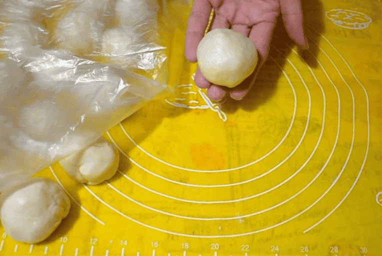 Цим часом можна ввімкнути духовку для прогрівання та підготувати деко. Тісто, що відпочило, ділимо на 17 шматочків, кожен шматочок тіста підкочуємо в кулю. Одну “кульку” залишаємо, а решту накриваємо плівкою.