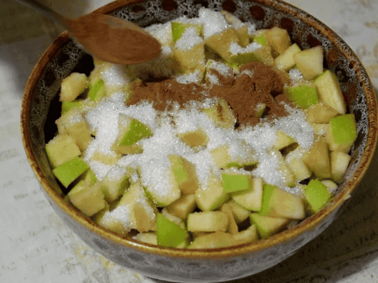 До нарізаних яблук додаємо цукор і за бажанням корицю, перемішуємо і поки що відставляємо.