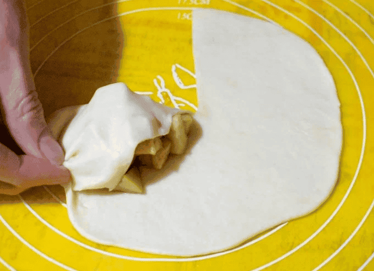 Повертаємо тісто плавно, не розтягуючи, щоб воно у вас не порвалося. На всьому етапі згортання, намагайтеся защипувати край тіста знизу.