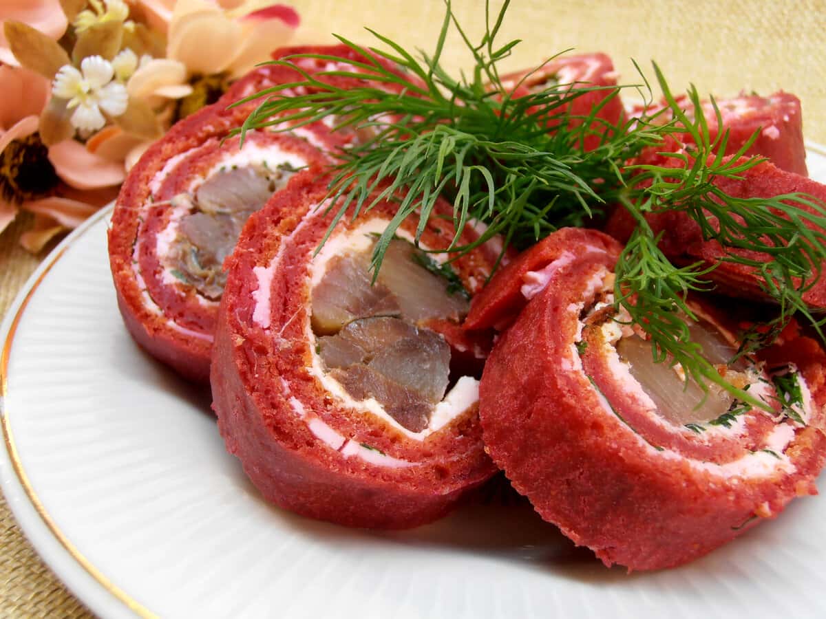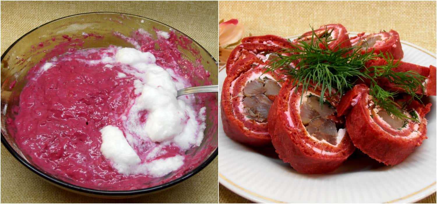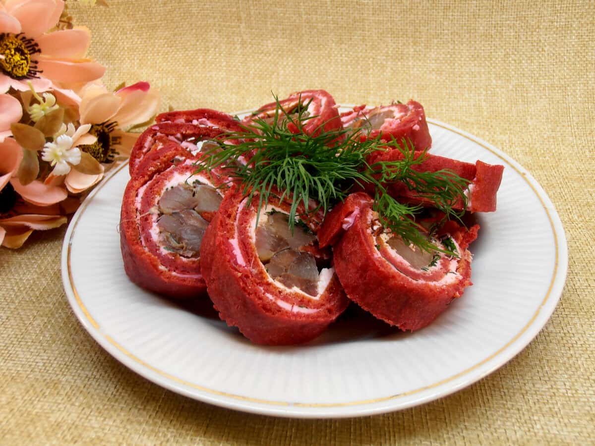 Закусочний буряковий рулет з оселедцем — це красива, смачна закуска на святковий стіл і не тільки. Його можна подати на сімейну вечерю, приготувати до приходу друзів, а також він відмінно підійде для фуршетного або шведського столу.