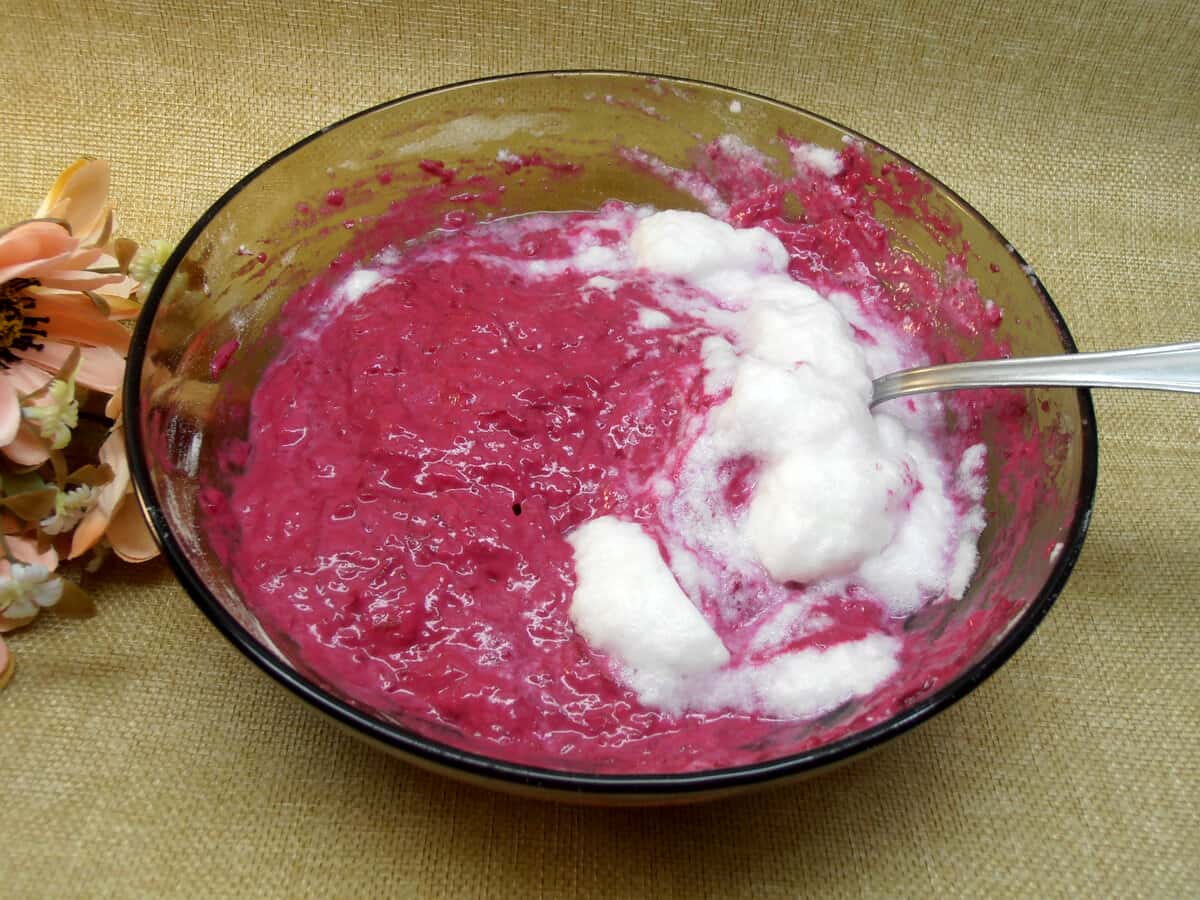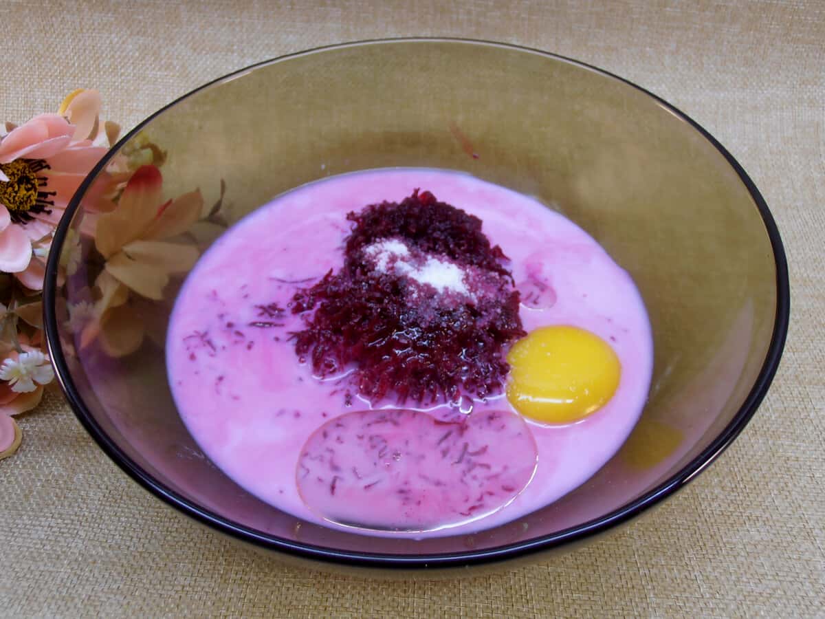 2. Буряк очищаємо від шкірки і тремо на дрібній терці. У глибокій мисці з’єднуємо буряк, молоко, жовток, сіль, олію. Все добре змішуємо.